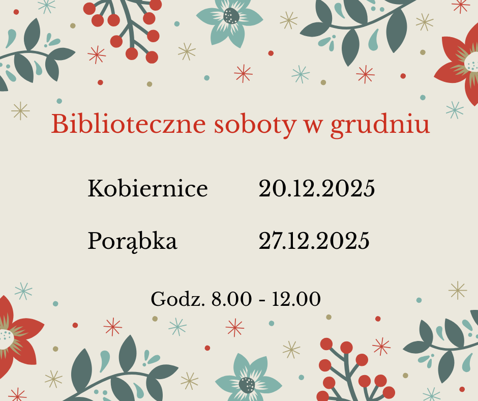 3 gru 2025 Biblioteczne soboty w grudniu przez admin | wpis w: Uncategorized | 0 Biblioteczne soboty w grudniu ! Filia biblioteczna w Kobiernicach 20.12.2025 GBP w Porąbce 27.12.2025 Godz. 8:00-12:00