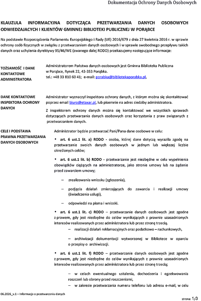 Państwa dane osobowe będą przetwarzane w celu obsługi czytelników w zakresie udostępniania zbiorów bibliotecznych.