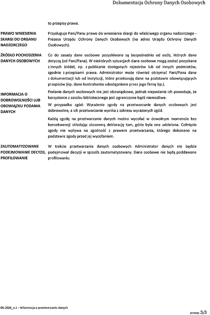 Podanie danych osobowych nie jest obowiązkowe, jednak niepodanie ich powoduje, że korzystanie z zasobu bibliotecznego jest ograniczone bądź niemożliwe.